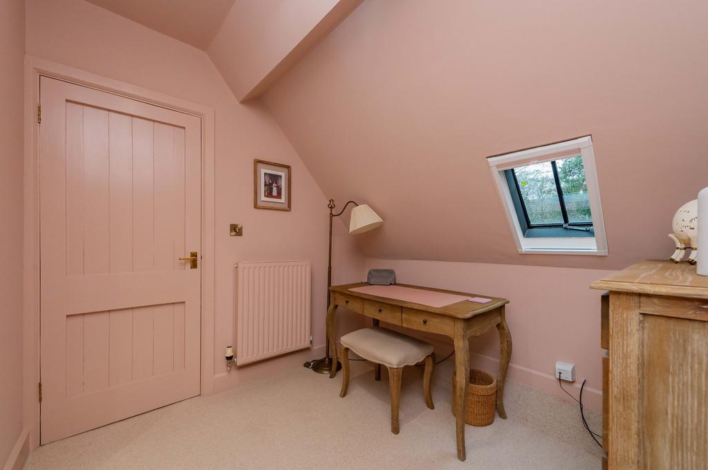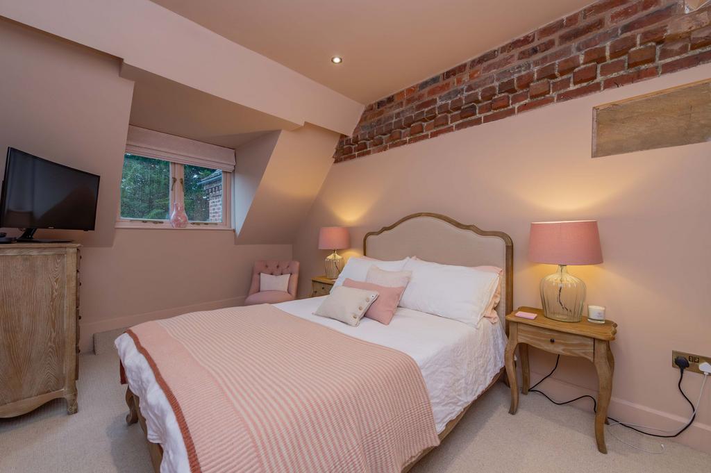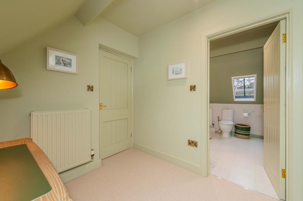 The turn staircase, which is finished with a plush cream carpet that extends throughout the upper floor, leads to a striking galleried landing. A mezzanine area provides a perfect spot for quiet contemplation, featuring a floor-to-ceiling painted timber balustrade. Bedrooms 1 and 2 are a mirror image of each other, both offering luxurious, thoughtfully designed private spaces. The Master Bedroom (Bed 1), painted in a soft pink, is accessed via an initial dressing area with a skylight; the main bedroom is a double room with a full-width built-in wardrobe and a charming dormer window providing views over the private frontage. Exposed brickwork and an engraved stone bearing the building's age-1754-serve as a powerful and beautiful link to the property's past. The first ensuite is a haven of modern luxury, featuring a panelled bath with a mixer tap and handheld shower, a separate shower cubicle with both a rainfall and a separate shower head, a WC, a wide vanity basin with storage, and a fitted floor-to-ceiling storage cupboard, all finished with complementary tiled floors and walls. Bedroom 2 is painted in a soft green and also features a dedicated, skylight-lit dressing room leading into the main bedroom area. This room has a built-in wardrobe and a dormer window to the front, and the second ensuite includes a corner shower cubicle, a WC, a vanity basin with storage, and a skylight, complemented by a full-length built-in wardrobe.