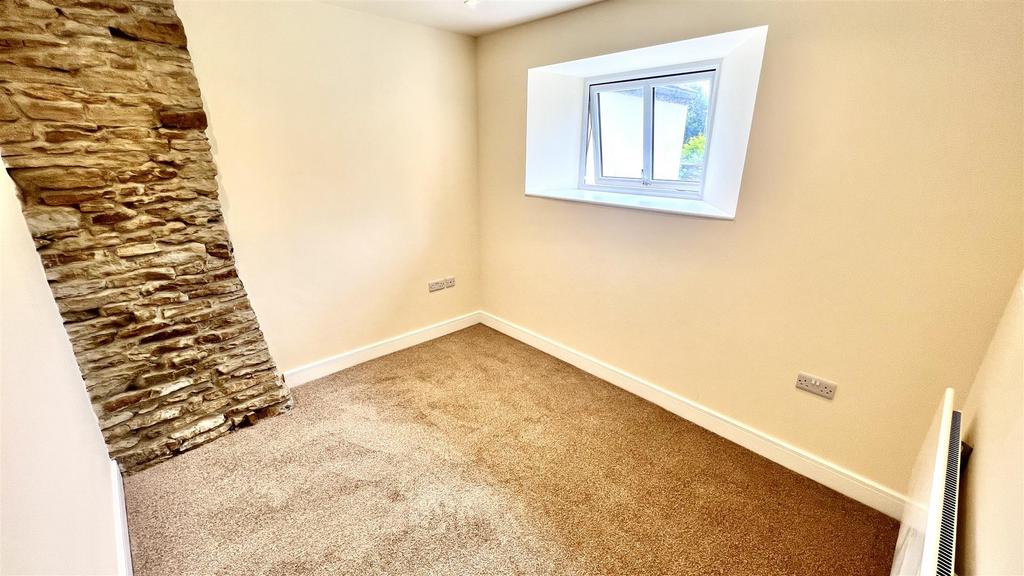 The rear part of the room is lounge focussed and features a large chimney breast with stone hearth, creating a central focal point and giving space to house an electric fire if required. The space has neutral decor, carpeted flooring, recessed spotlights, exposed timber beams and stonework reflecting the buildings history and a front facing window floods the room with an abundance of natural light.