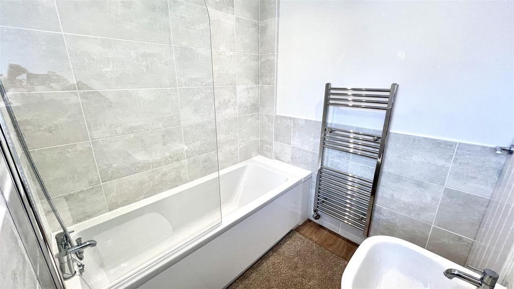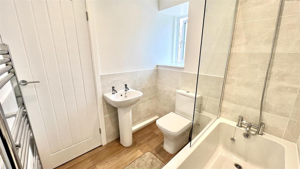 Bathroom - 1.92 max x 1.87 max (6'3" max x 6'1" max) - This modern three piece bathroom is partly tiled and features a panelled bath with chrome tap and shower attachment, adjustable glass shower screen, a pedestal handwash basin with chrome taps and a low flush toilet. There is a front facing obscure glazed window, laminate effect vinyl flooring, recessed spotlights and a chrome ladder towel radiator.