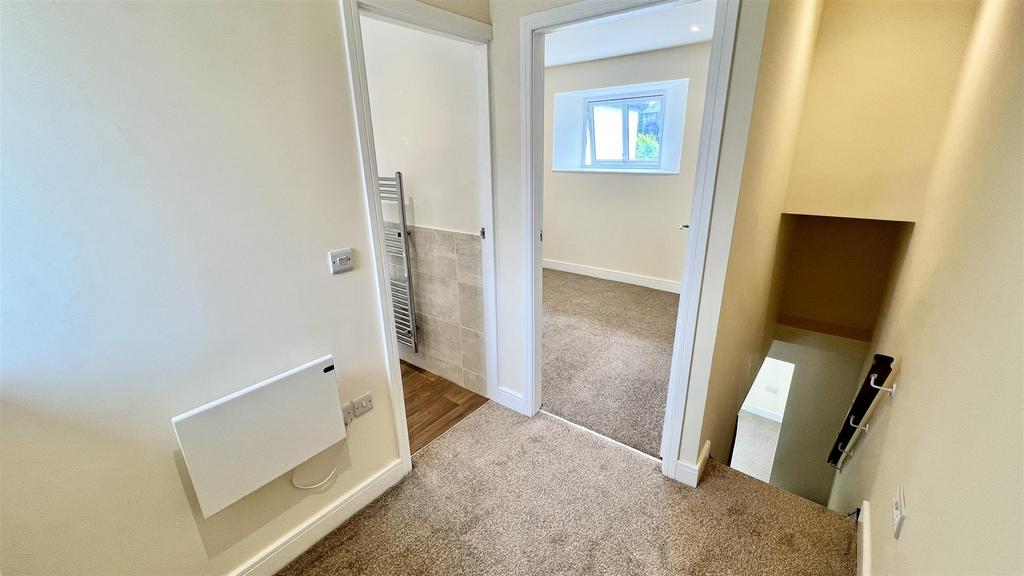 First Floor Landing - 1.89m x 1.71m approx (6'2" x 5'7" approx) - Stairs ascend from the ground floor to the first floor landing which is surprisingly spacious and could house freestanding furniture if required. There is carpeted flooring, recessed spotlights, neutral decor, a front facing window and doors lead to the bedroom and bathroom