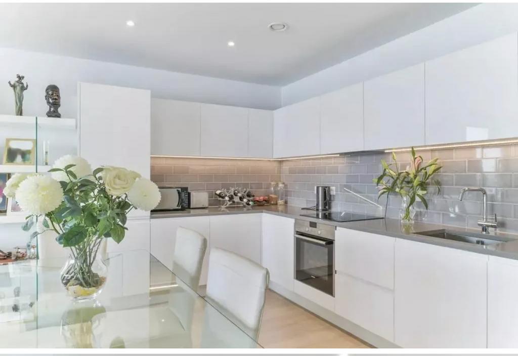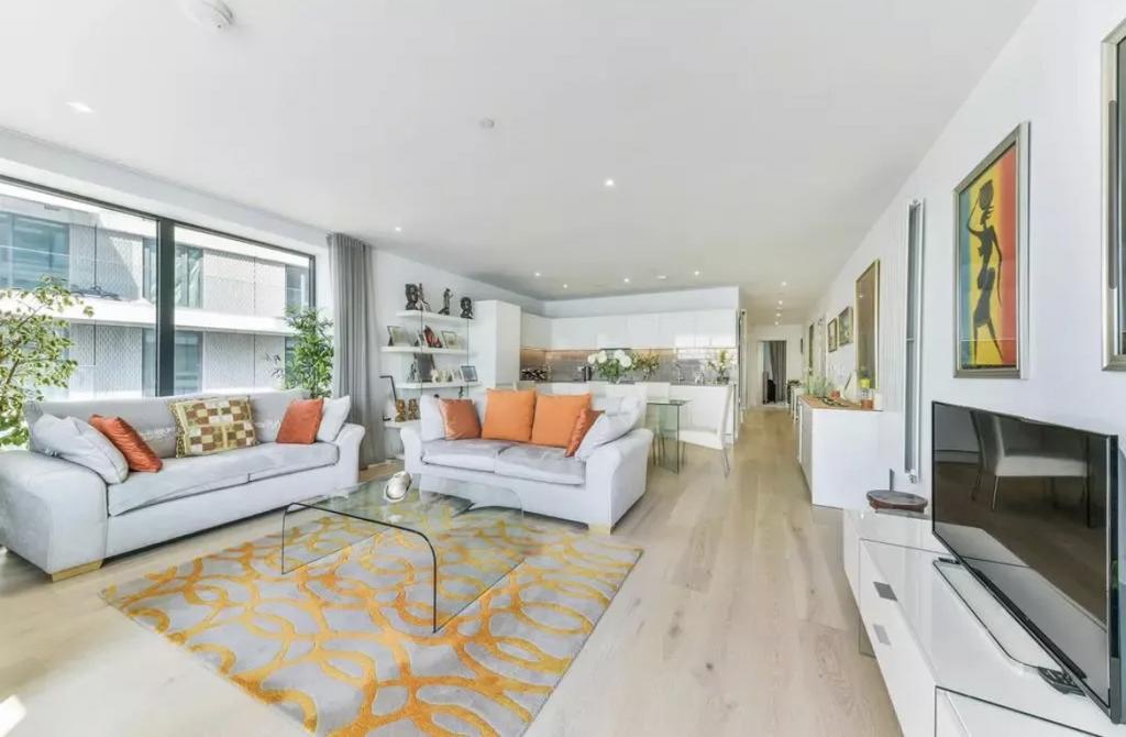 The apartment showcases a dual-aspect open-plan kitchen and reception area adorned with elegant engineered oak flooring, creating a seamless blend of style and functionality. The three spacious bedrooms include a luxurious primary suite with an en-suite bathroom, complemented by a second sleek monochrome bathroom.