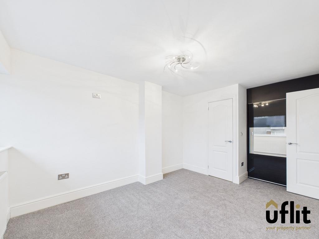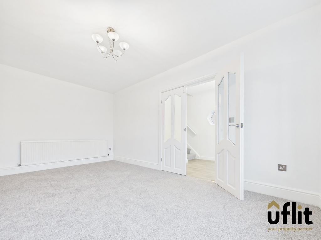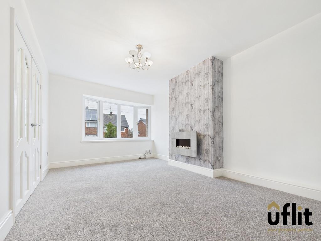 A bright and stylish lounge enhanced by a beautiful bay window overlooking the front garden. The feature wall with a modern electric fire creates an attractive focal point, while the soft fitted carpet adds comfort and warmth to the space. A radiator provides efficient heating and double white glazed doors.