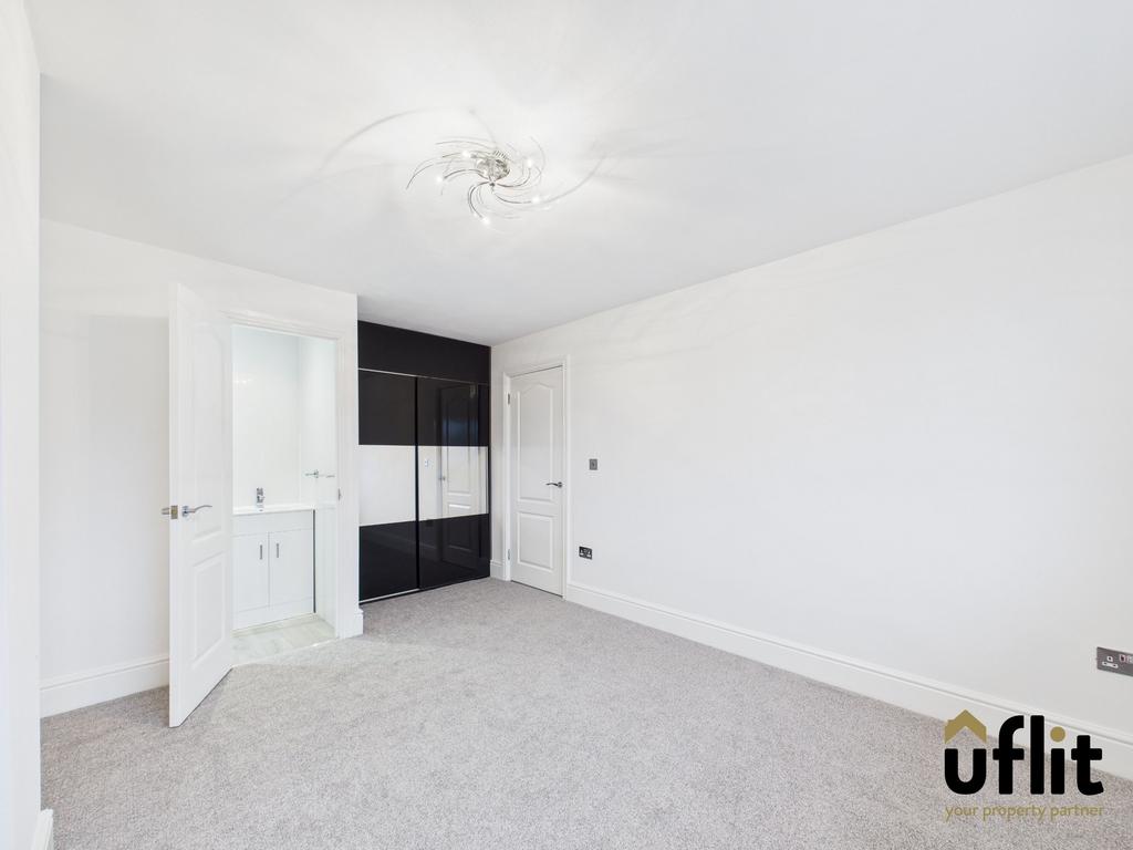 A generously sized master bedroom with a window overlooking the front of the property. The room is carpeted for comfort and includes a radiator for warmth. It also benefits from mirrored fitted wardrobes, offering excellent storage while maintaining a sleek look. A door leads into the private shower room.