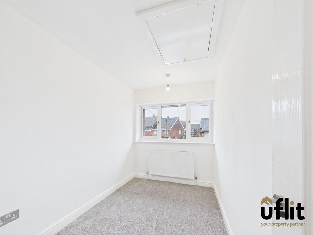 A front-facing bedroom with radiator, carpet and a single fitted wardrobe with rail and shelving. The room also provides access to the loft via a hatch partially boarded with ladders for convenience.