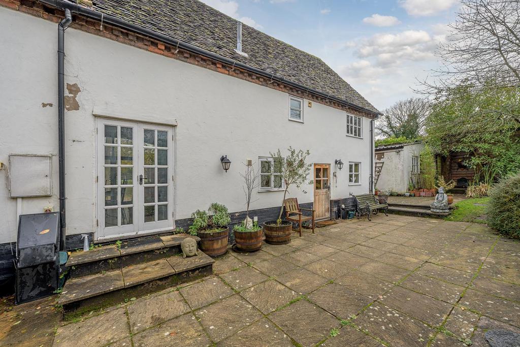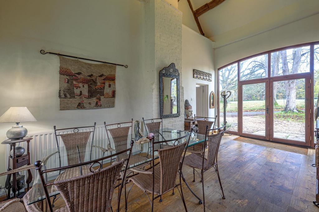 Positioned at the side of a long private tree-lined driveway, entirely concealed by mature parkland and electric gates is this exceptionally unique and enchanted property. Offering immense character and charm through many original features; this wonderful barn conversion is perfect for multi generational living for large and mixed families due to its flexible and versatile layout. Having calming views across communal gardens through captivating floor-to-ceiling arch windows from the lounge; the property is centred around an impressive dining hall accessed via double doors with 23 ft height void creating a wonderful sociable backdrop for entertaining friends and family. The breakfast kitchen is well equipped with integral appliances, offers dual aspect and stable door to rear garden. Accessed off the kitchen through a lobby area leads to a utility/ WC adding an essential sense of practicality. Completing the ground floor is one of four bedroom suites with useful built-in storage; perfect for teenagers or elderly relatives. With stairs leading from comfortable-size lounge with feature log burning stove, leads to two further bedrooms, one with walk-in wardrobe and both with ensuite facilities. The master bedroom is located off an impressive mezzanine landing accessed off the dining hall with low-level beam and built-in storage with further dual aspect and ensuite bathroom. The rear garden is beautifully established and is partly walled with various seating areas, large well maintained lawn and access to two separate garages. To the front of the property is a large private gravelled driveway allowing space for multiple vehicles. For any discerning buyers who idolise semi rural living with the practicalities of being closely situated to nearby Towns and Villages and want something that stands out; viewings are highly recommended to appreciate what's on offer.