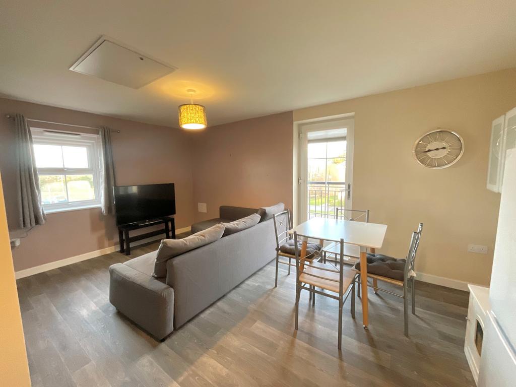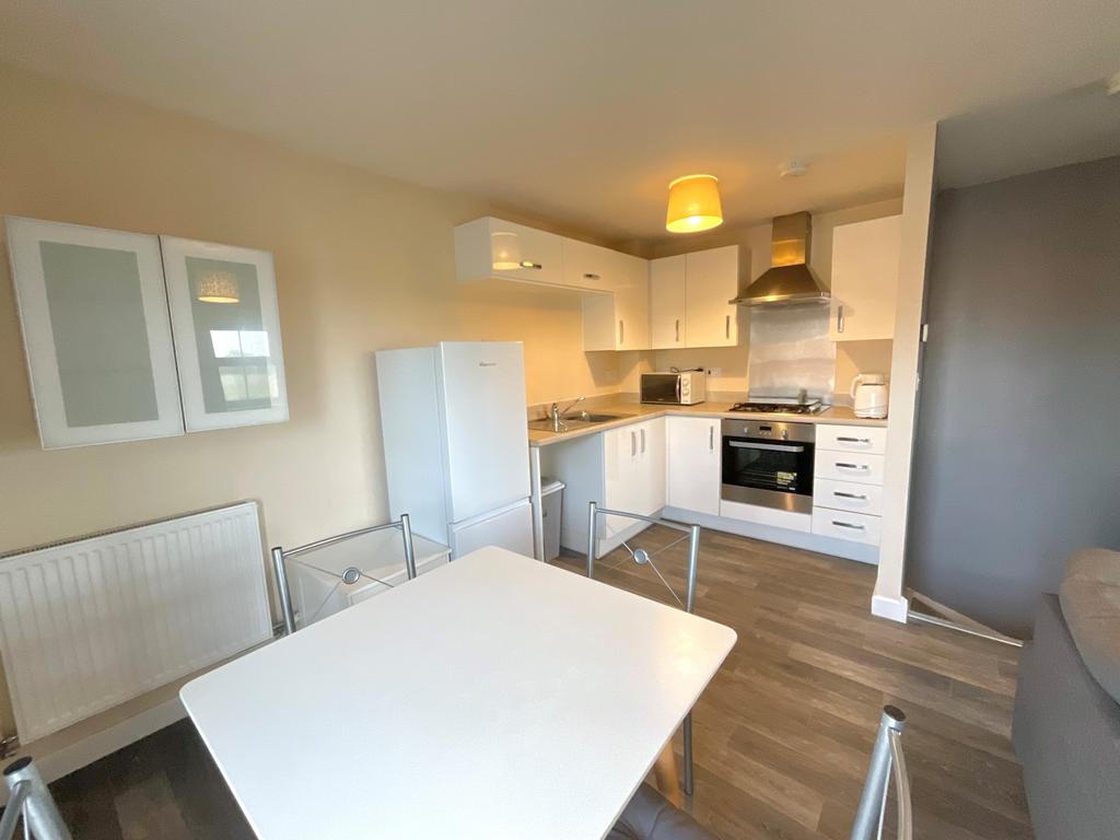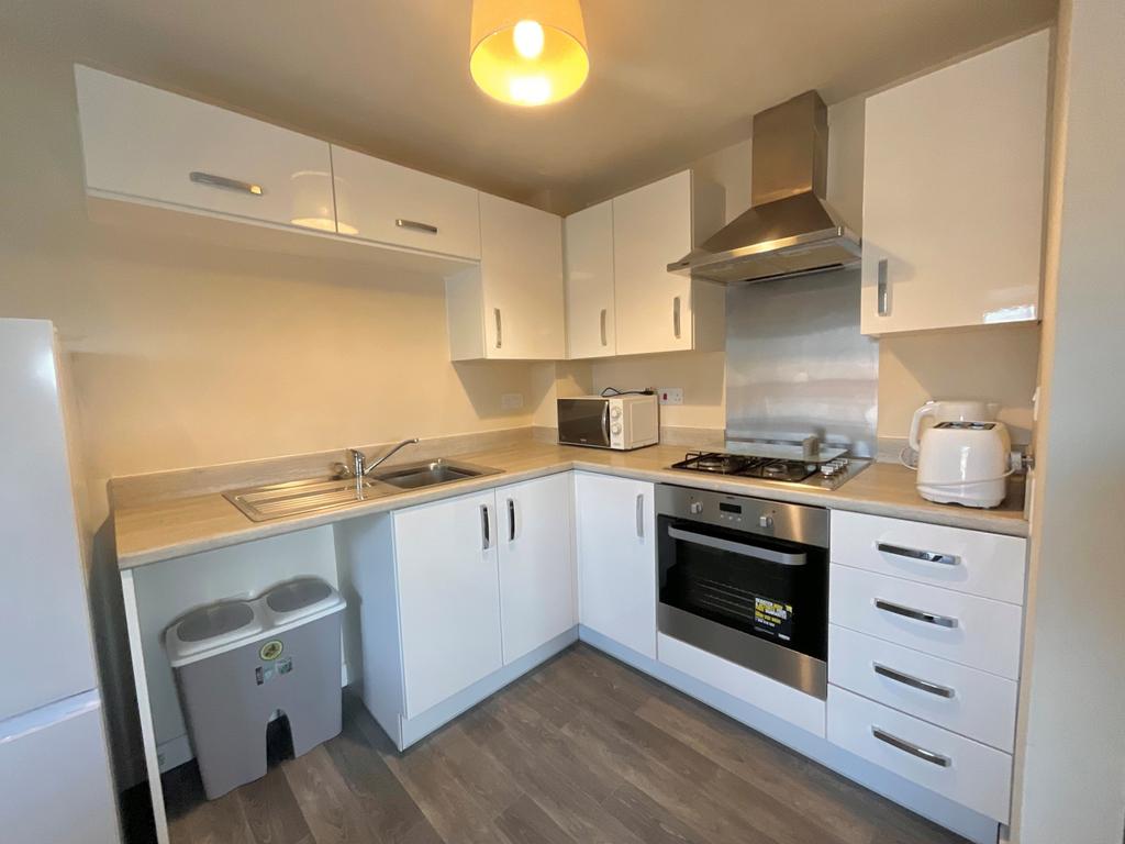 Upstairs, the property opens up into a bright open-plan lounge, kitchen and dining area, creating a versatile living space. The kitchen includes a gas hob, while the living area features laminate flooring and a Juliette balcony, allowing natural light to flow through. A further storage cupboard houses the boiler, adding to the property-s practicality.