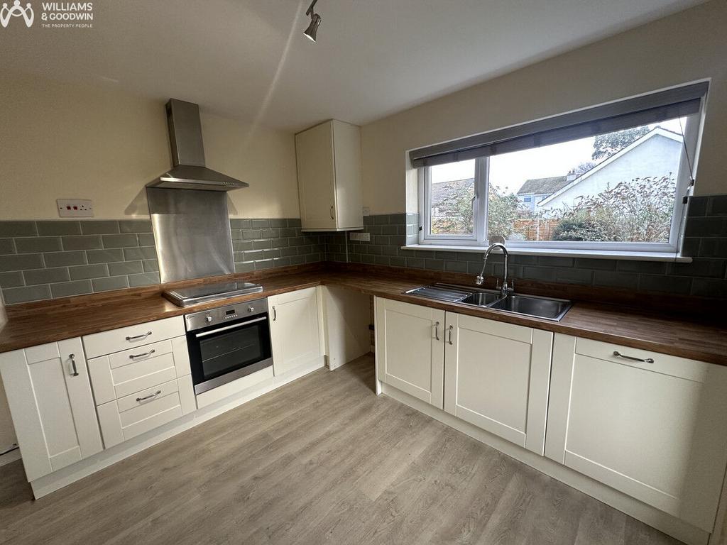 The modern kitchen is fitted with a matching range of base and eye level units with worktop space over the units. Side door leading out to the garage and driveway.