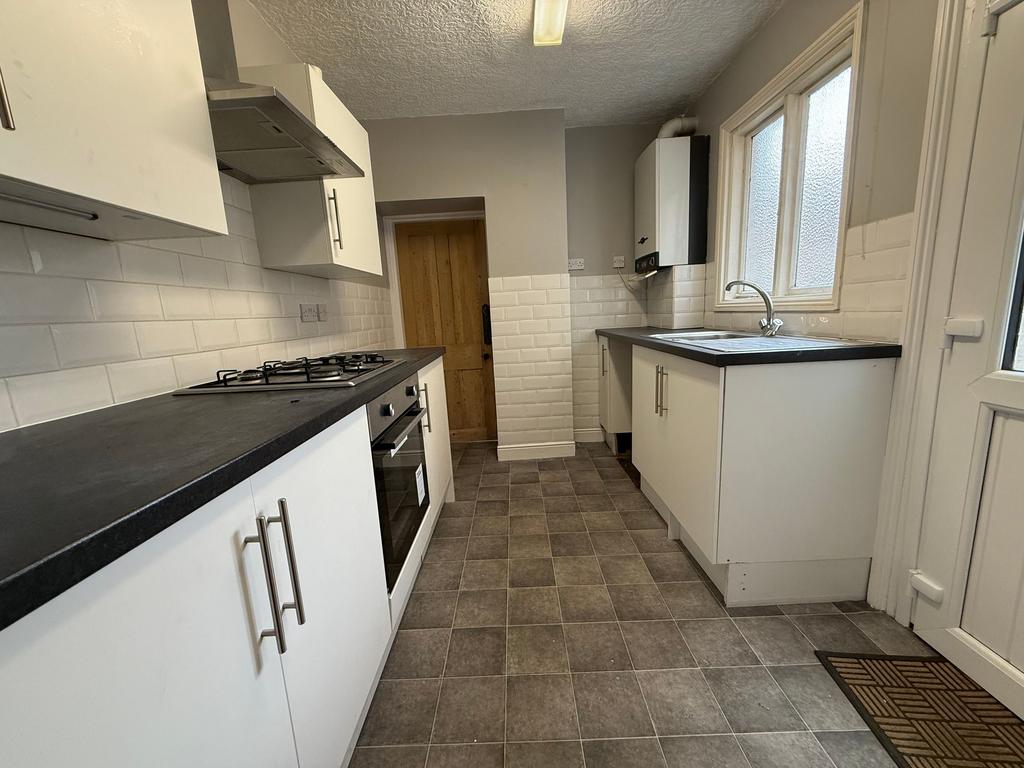 Modern kitchen with electric cooker and gas hob provided. There is space and plumbing for white goods.