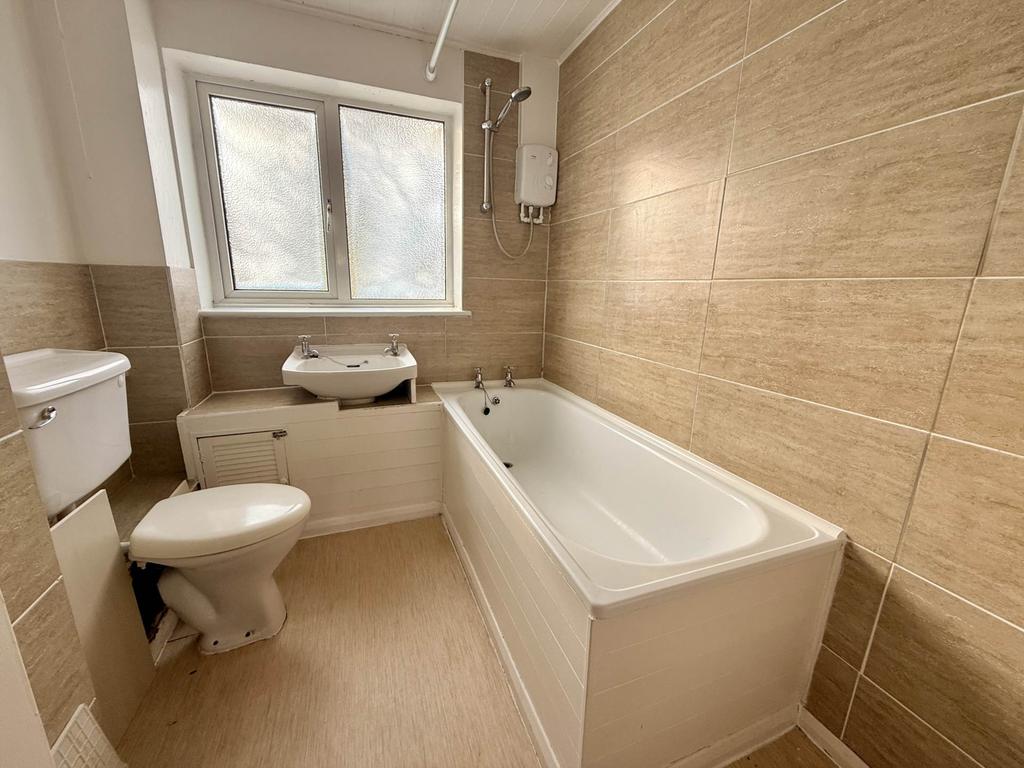 Fitted in a three piece suite comprising; Low level WC, wash hand basin and panelled bath with shower over. Tiled to splash back areas. Tiled flooring. Double glazed frosted window to rear.