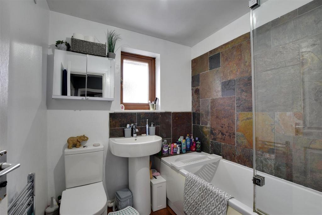 Bathroom - 1.93m x 1.85m (6'4 x 6'1) - Window to the rear, white suite comprising panelled bath with shower and screen over, pedestal wash basin, wc.