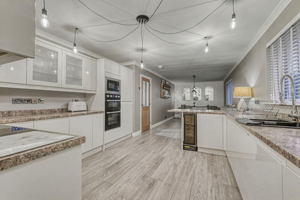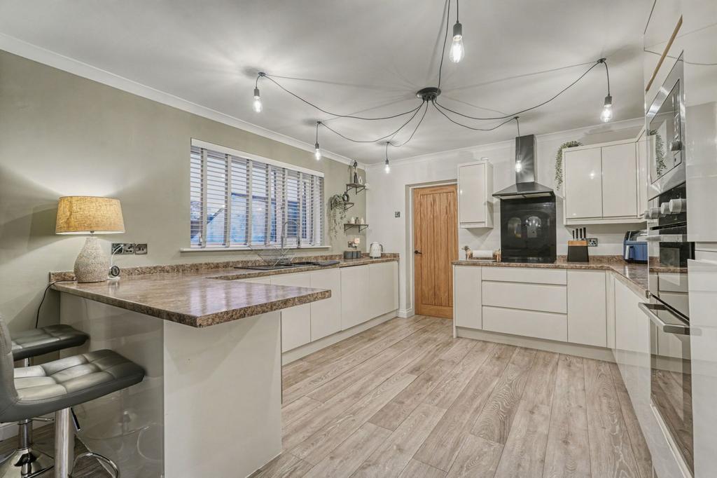 The main lounge has room to properly stretch out, with a corner stove that’s perfect for cosy evenings in. It’s balanced by the full-width kitchen diner at the back – a brilliant space for busy mornings and family evenings, with sleek handleless units, integrated appliances and loads of room to gather.