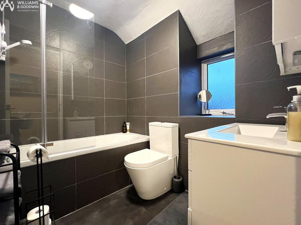 Three-piece suite comprising shower, pedestal wash hand basin and WC. Window to rear