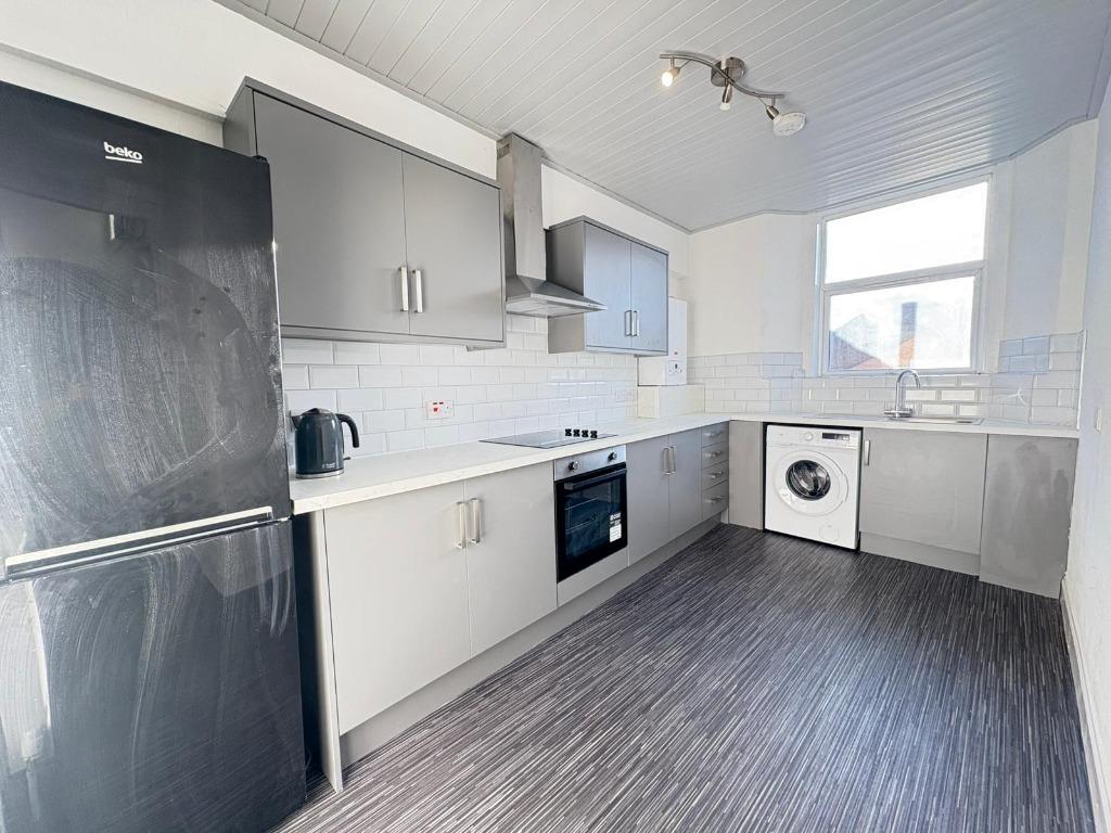 The property boasts a bright open-plan living room and kitchen area, freshly painted and newly carpeted to create a warm and welcoming atmosphere. The brand new fitted kitchen features light grey vinyl flooring, sleek modern units, and high-end integrated appliances, perfect for those who enjoy cooking and entertaining.