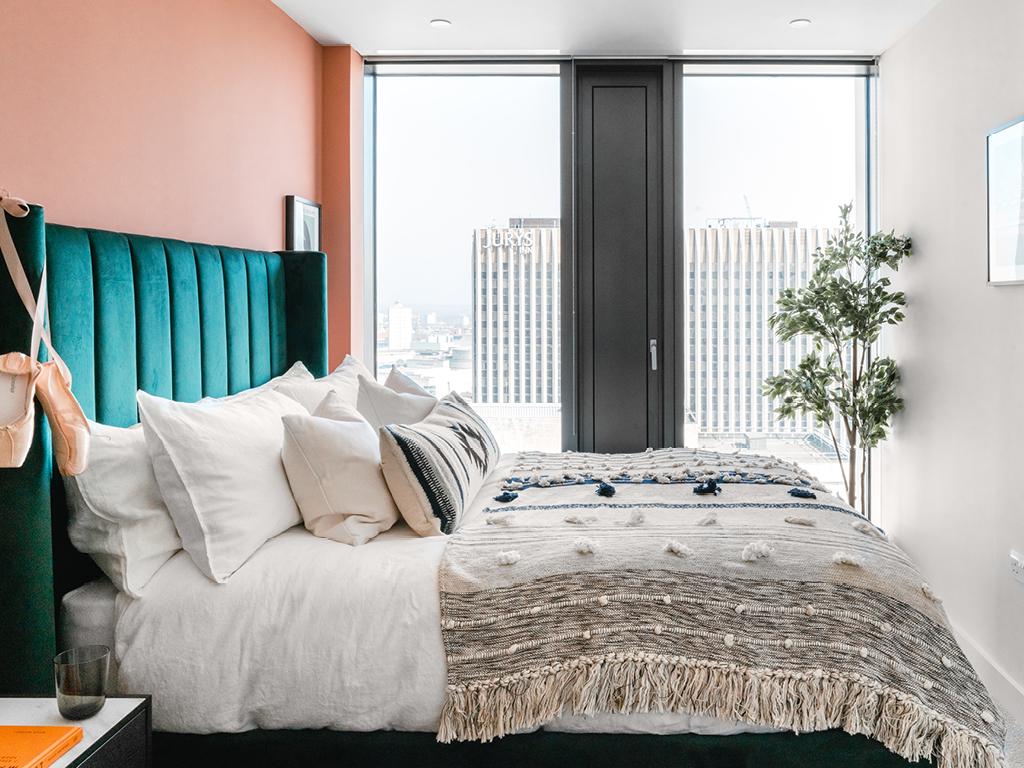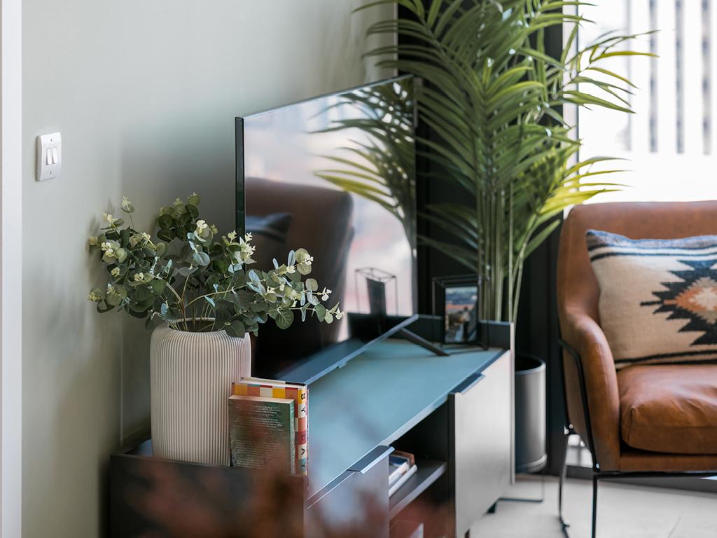 Light and spacious with floor to ceiling windows and blackout blinds. Plush three-seater sofa, lounge chair, media storage unit with 50 inch Samsung smart TV and nested coffee table with mirrored tops.