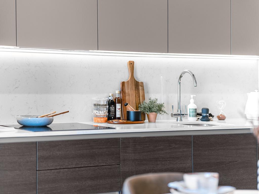 Open plan, sleek and modern with quartz worktops and integrated premium appliances including touch control, ceramic, 4 ring induction hob, combi oven, 3 quarter large fridge with icebox compartment, dishwasher plus washer/ dryer to separate utility cupboard. Room to entertain with marble topped dining table and 4 chairs.