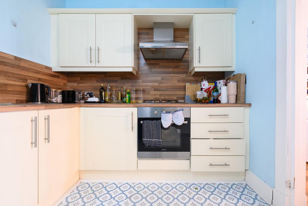 The kitchen is tucked just off the lounge and strikes a lovely balance between style and practicality. Crisp cream units are paired with rich walnut-effect worktops and splashbacks, and the patterned tiled flooring adds a playful pop. It’s a bright and functional space, ideal for keen cooks or casual diners alike.