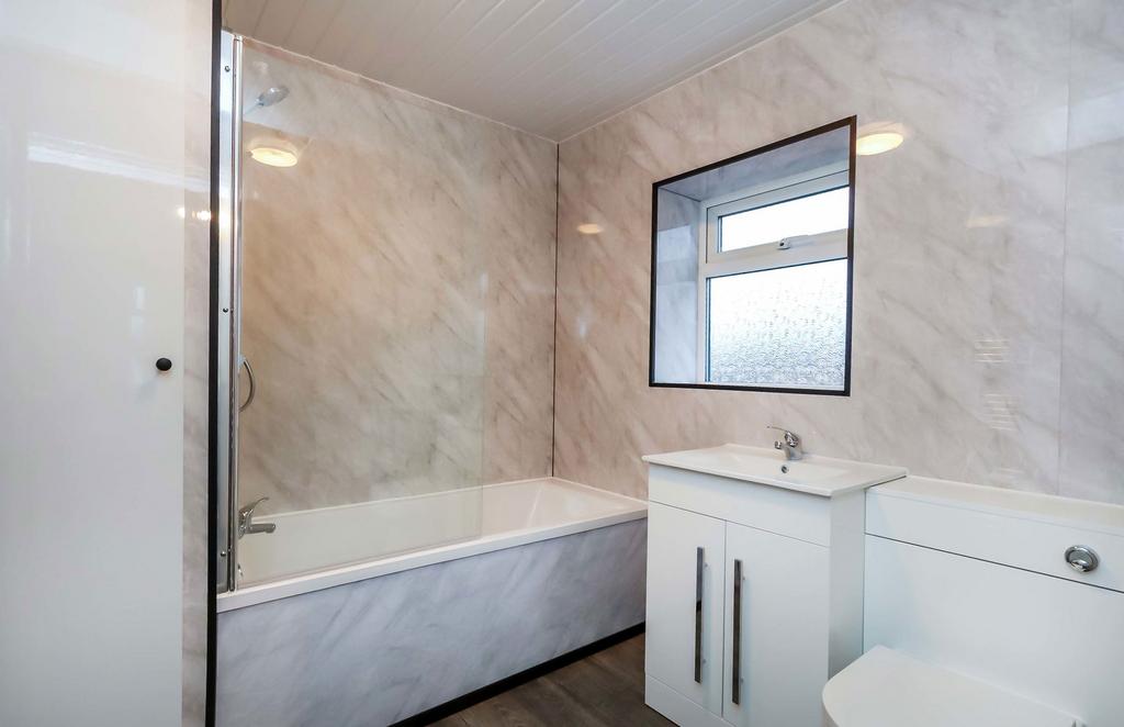 UPVC double glazed window. White suite including panelled bath with mixer tap, thermostatic shower and shower screen, vanity wash hand basin with cupboard below and low level WC. Cupboard housing 'Glow-worm' gas fired central heating boiler. Chrome towel rail/radiator. Close boarded ceiling, UPVC double glazed window.