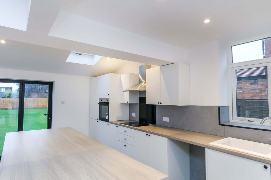 Newly extended, ideal family space. UPVC double glazed side window with single drainer, white enamel sink unit below, a range of base units, wall cupboards and woodgrain working surfaces. Island unit with further base units, wine racks, woodgrain working surfaces and breakfast bar. 'Lamona' four ring ceramic hob with cooker hood above, split level oven. Tall wall housing unit for fridge and freezer. Space and plumbing for washing machine and dishwasher. Living and dining area with recessed spot lighting, two double glazed 'Velux' style roof lights, bifold doors lead to the rear garden. Tall wall radiator.