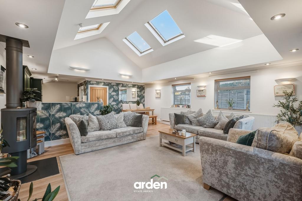 Upon entering, you are welcomed into an entrance hallway providing access to the exceptional open-plan kitchen/diner/family room. The contemporary kitchen is fitted with a range of modern units and integrated appliances, including an oven, hob, extractor fan, fridge/freezer, and dishwasher. The space also incorporates a designated dining area and a comfortable lounge area, featuring a log-burning stove and a vaulted ceiling with Velux windows that flood the room with natural light. French doors open out onto the rear garden.