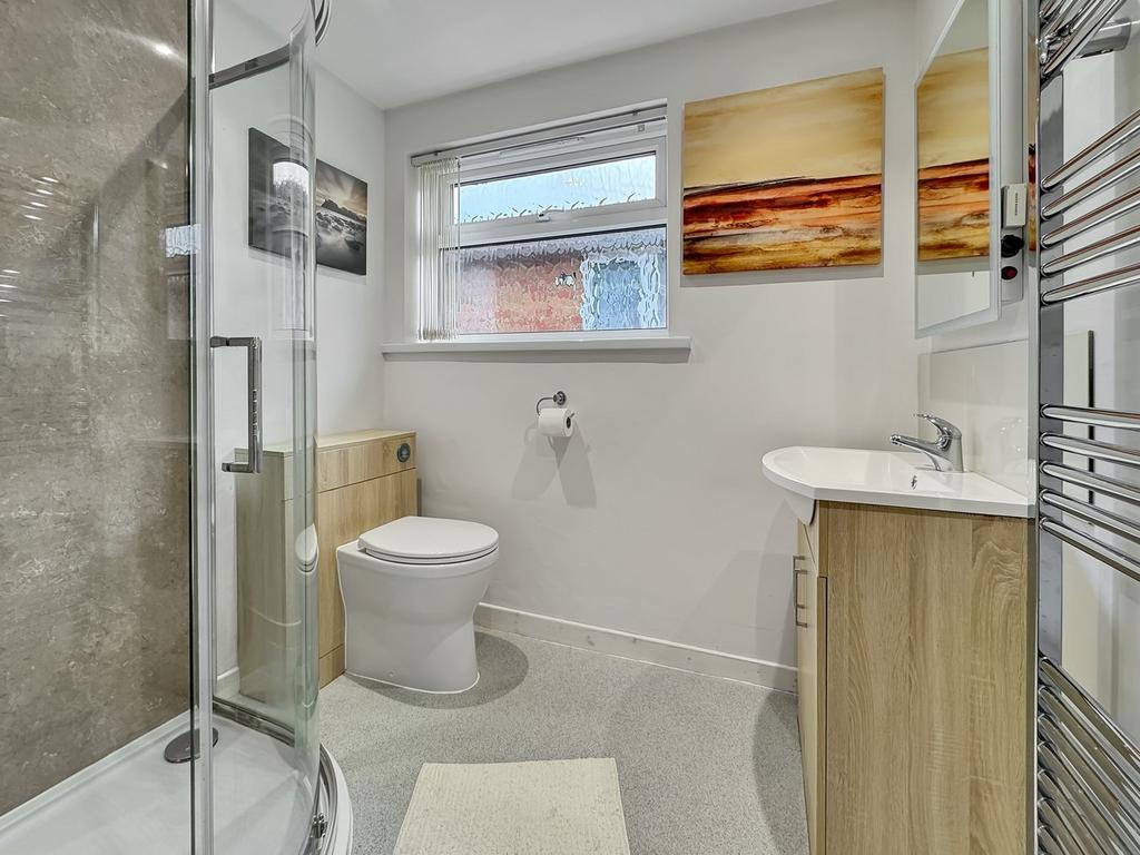 Obscure window to side, heated towel rail, shower cubicle, vanity wash hand basin, vanity WC.