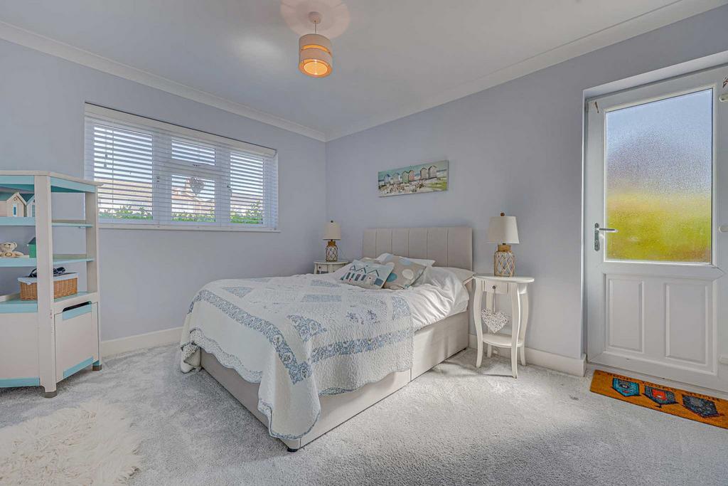 Located just off the downstairs hallway, Bedroom 5 offers a flexible space that can serve as a guest bedroom, home office, or additional living area. The room is well-lit with a fitted ceiling light, and features a double-glazed window to the front aspect, allowing in plenty of natural light. A double-glazed door provides access to the side aspect of the property, offering potential for private entry or easy outdoor access. The room is finished with fitted carpets, adding warmth and comfort underfoot.