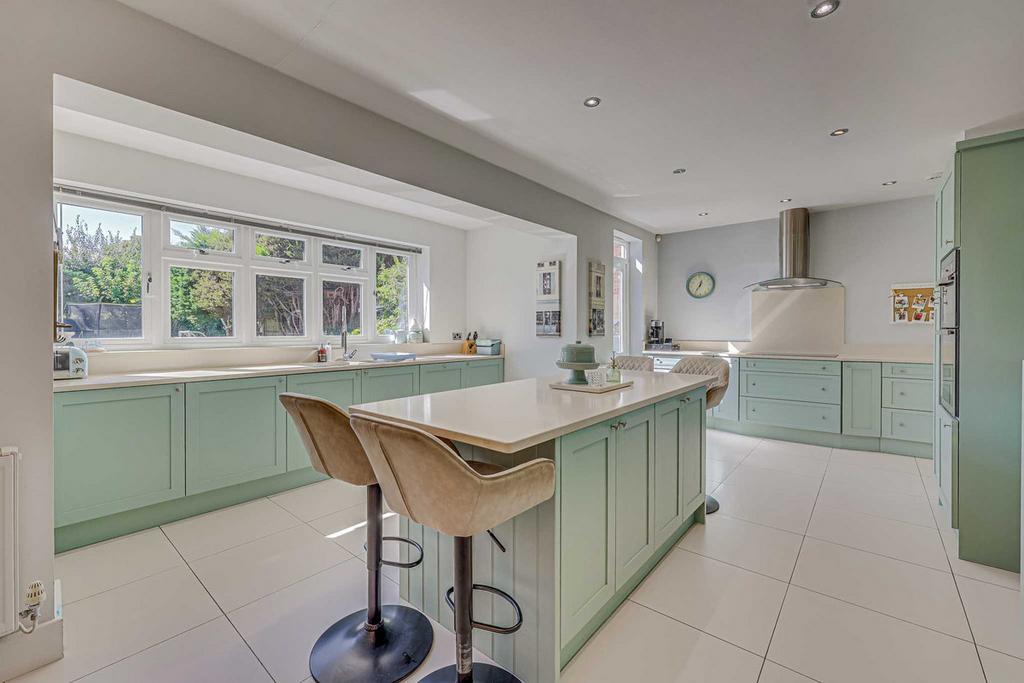 The heart of the home is the large, well-appointed family kitchen—designed with both functionality and style in mind. It features a spacious breakfast bar, ideal for casual meals or enjoying a morning coffee while overlooking the garden. The kitchen seamlessly flows into a separate open-plan dining area, perfect for hosting dinner parties or family gatherings. With ample room for a large dining table and direct access to the garden, this space is tailor-made for entertaining and everyday family life alike