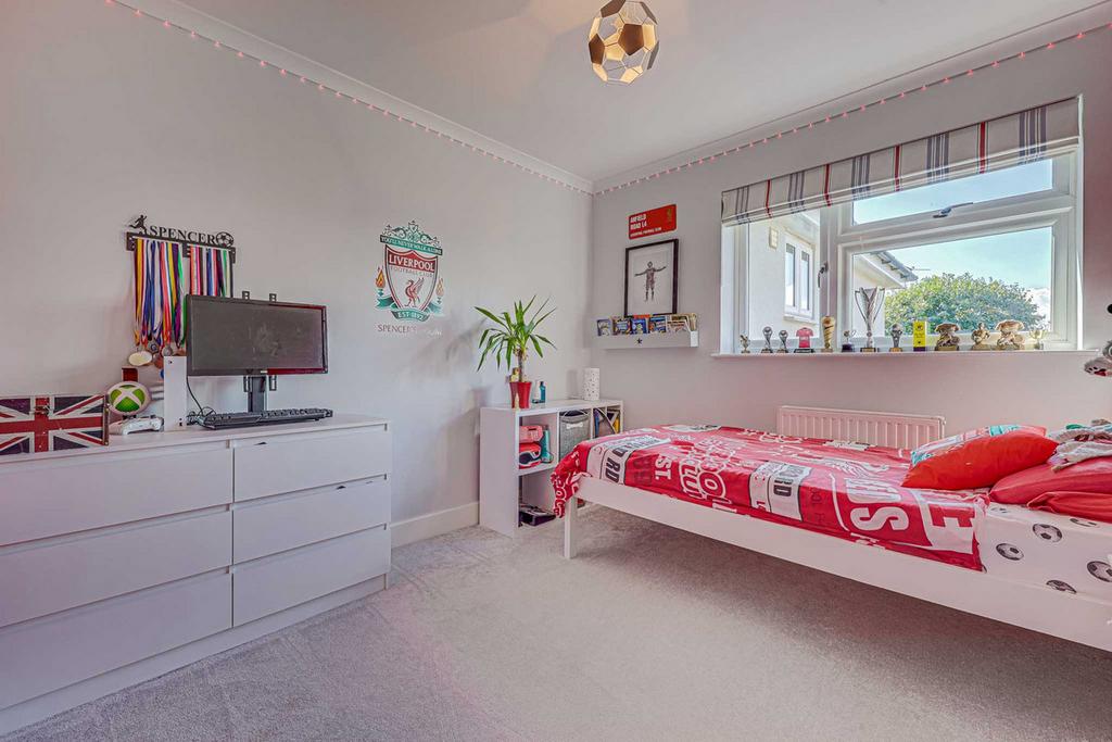 Bedroom Three is a comfortable and well-appointed room, ideal for use as a child’s bedroom, guest room, or home office. A fitted ceiling light provides overhead illumination, while double-glazed windows to the rear aspect fill the space with natural light and offer views over the garden. The room benefits from fitted carpets, adding warmth and comfort, and a radiator ensures a cosy environment year-round. A built-in wardrobe and additional cupboard provides practical storage space, helping to keep the room tidy and functional.