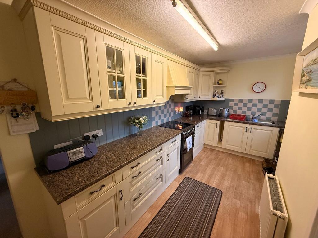 16' 1" x 7' 7" (4.90m x 2.31m) with part tiled and part panelled walls, an excellent range of quality cream fronted base and wall cupboard units with Formica working surfaces, some wall cupboards having glazed doors, stainless steel 1 1/2 bowl single drainer sink unit with mixer taps, space for slot in oven (optional) with cooker hood over, pull out breakfast bar, central heating radiator, roller blinds to window, rear exterior door.