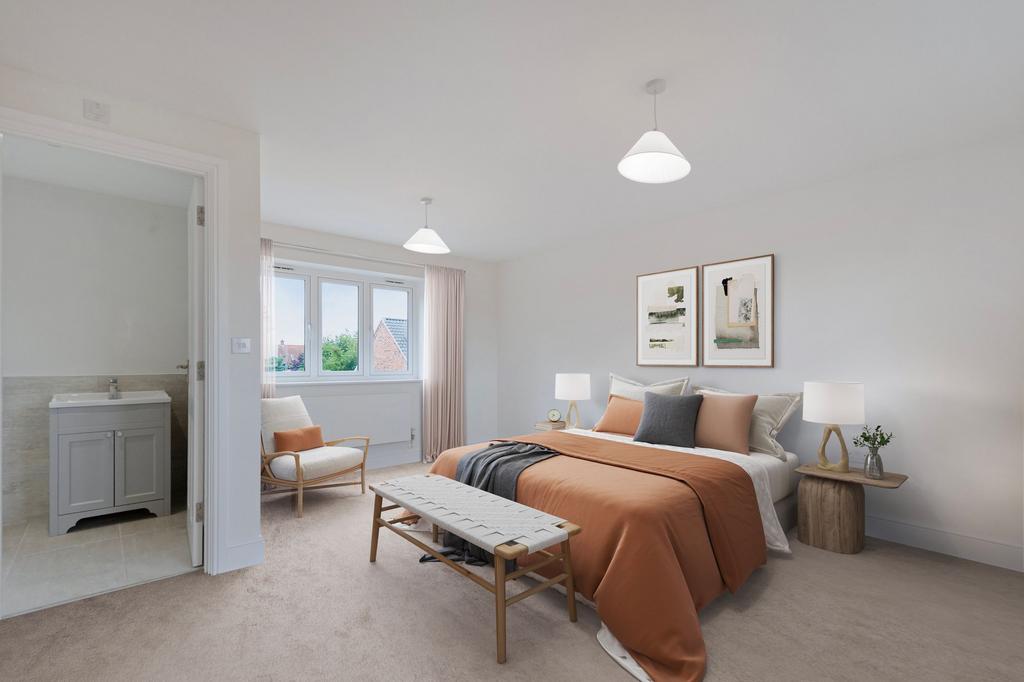 Upstairs are four good-sized bedrooms and a stylish family bathroom, including a standout principal suite with en-suite, walk-in wardrobe, and a gable-end window with countryside views.