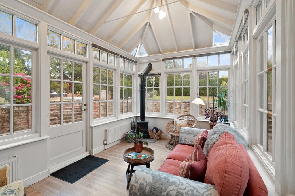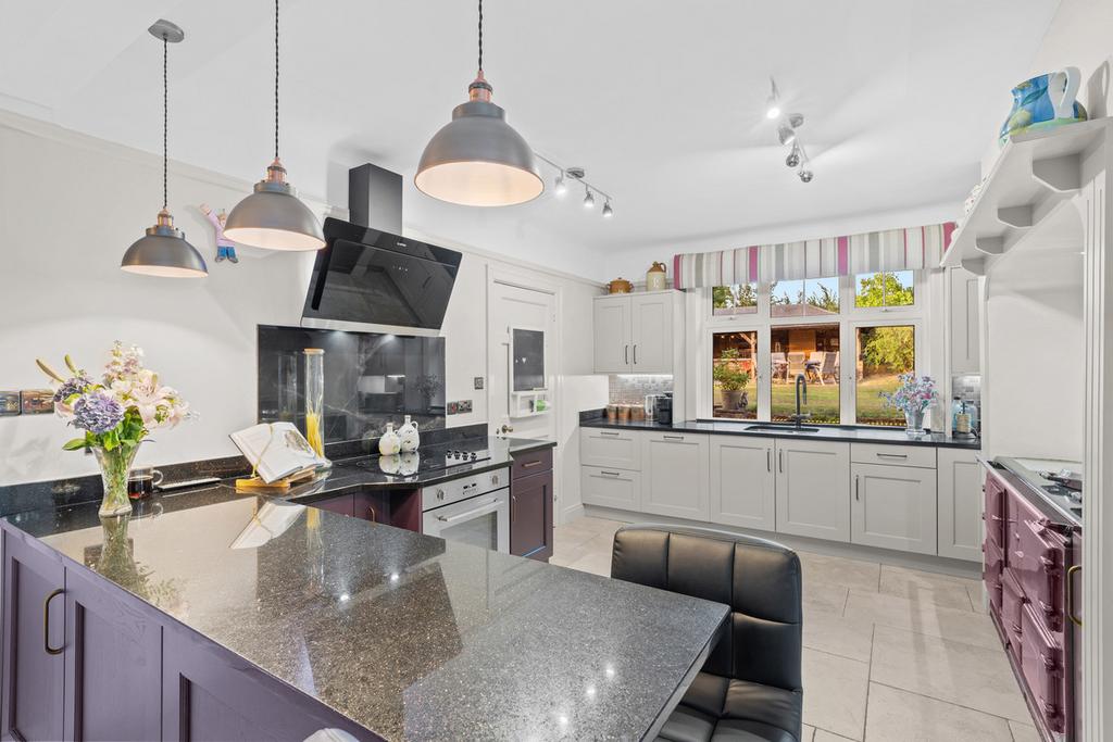 At the heart of the home lies the kitchen/breakfast room, a superb blend of period charm and modern convenience. Bespoke cabinetry, a reconditioned Aga, a central breakfast bar, and ample space for a dining table make this a true hub for family living. A walk-in pantry, retaining the property’s original front door, provides access to the gardens, while on the opposite side, a light-filled conservatory, currently styled as a garden room, adds versatility as a tranquil retreat or vibrant entertaining space.