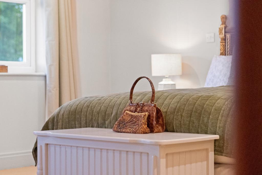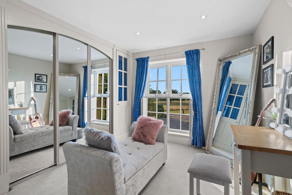 Two further bedroom suites continue the theme of refined elegance. Each benefits from its own dressing room and en suite, with one enjoying striking views over the driveway and paddocks, while the other boasts a private balcony with direct access to the garden. This versatile arrangement allows the suite to function independently from the main house, making it ideal for guests or staff accommodation.
