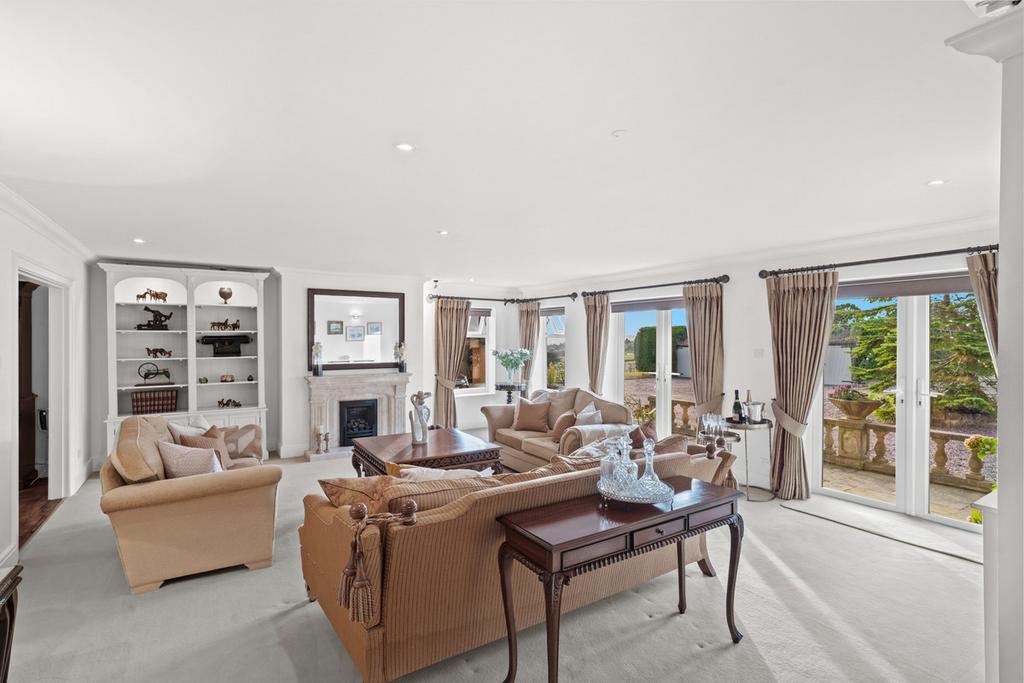 To one side, the sitting room provides a serene retreat, complete with bespoke built-in storage and a charming fireplace, the perfect spot to unwind with a book or enjoy quiet conversation. Opposite, double doors lead to the magnificent drawing room, where an abundance of natural light, a striking feature fireplace, and French doors opening onto the front terrace create a truly inviting space. Here, evening sunsets over the rolling countryside can be enjoyed in absolute comfort.