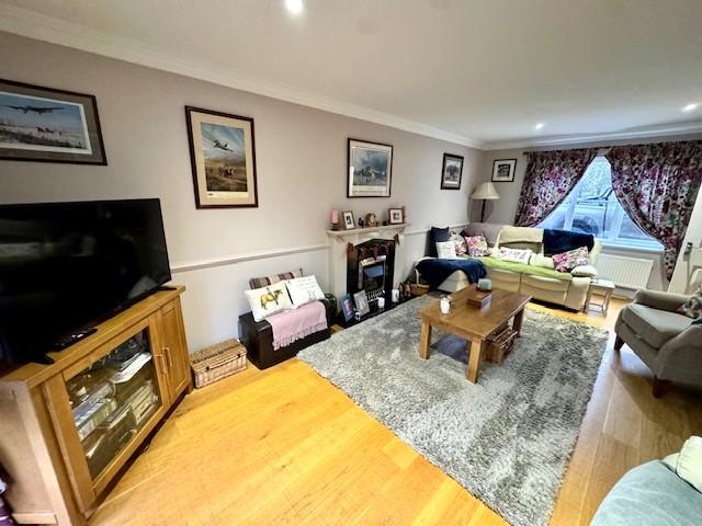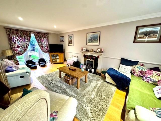 With marble Minster style fireplace housing electric fire, oak engineered flooring, radiator, coved ceiling, radiator, uPVC double glazed window to front elevation, recessed spotlights and uPVC double glazed patio door opening to patio area.