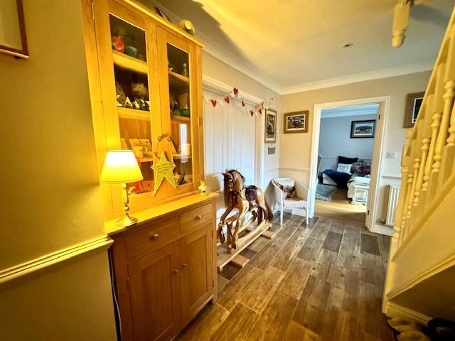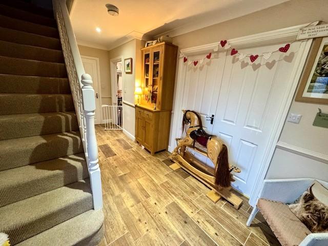 With composite double glazed front entrance door and matching side window, wood effect ceramic tiled floor, coved ceiling, dado rail and radiator.