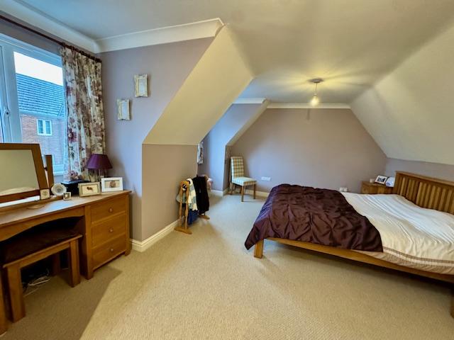 The bedroom is accessed via a walk through which has built-in double wardrobes to one side and access door to ensuite shower room the other side. The bedroom area has sloping ceilings, uPVC double glazed windows, telephone point, radiators. Maximum depth measurement.