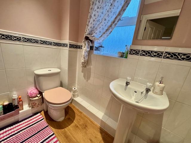 With wash basin and tiled splash back, wood effect ceramic tiled floor, close couple toilet, radiator and extractor fan.
