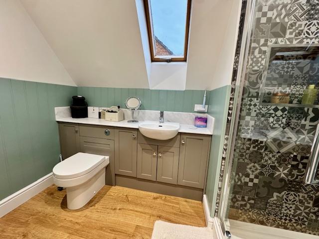 With tiled effect lined shower cubicle, modern vanity wash basin and cupboards below, close couple toilet with concealed cistern and marble shelf over, panel effect to part walls, chrome heated towel rail/radiator, roof window light. Maximum depth measurement.