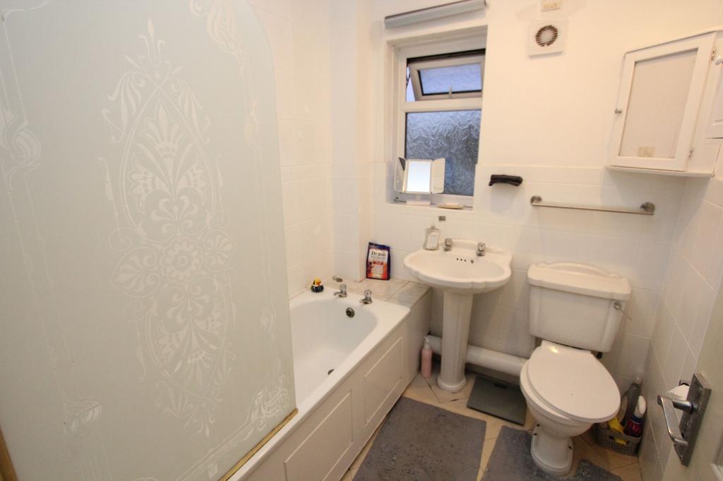 Panelled bath with electric mixer shower over. Pedestal wash hand basin. Low level WC. UPVC opaque window to rear. Radiator.
