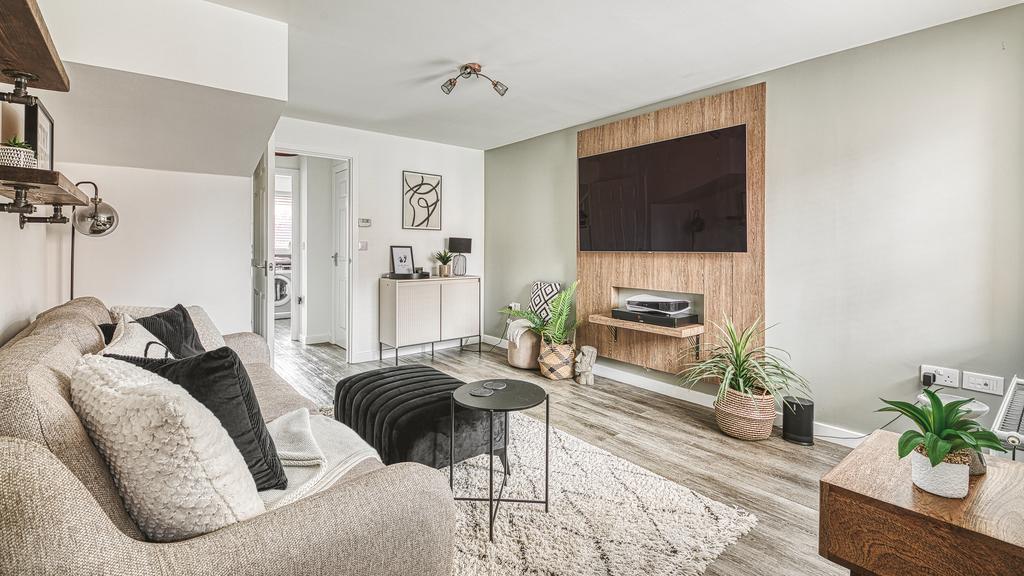 The ground floor features a sleek modern kitchen fitted with an integrated oven, fridge freezer and washing machine, complemented by wireless kitchen lighting and space for dining. The living area is both inviting and on-trend, enhanced by LED feature lighting with a fitted TV surround and mounting, which will remain (television excluded), creating a striking focal point.