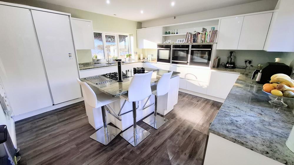 This fantastic modern kitchen is fully equipped to a high standard with a range of high-end appliances. It includes: integrated full-size fridge, 3x electric ovens with slide away doors, induction hob plus gas hobs, sleek ceiling mounted extractor with remote + lights, hideaway plug sockets, inset sink, breakfast island, integrated dishwasher, undercounter integrated freezer, and a range of cupboards/drawers. A door opens onto the garden.