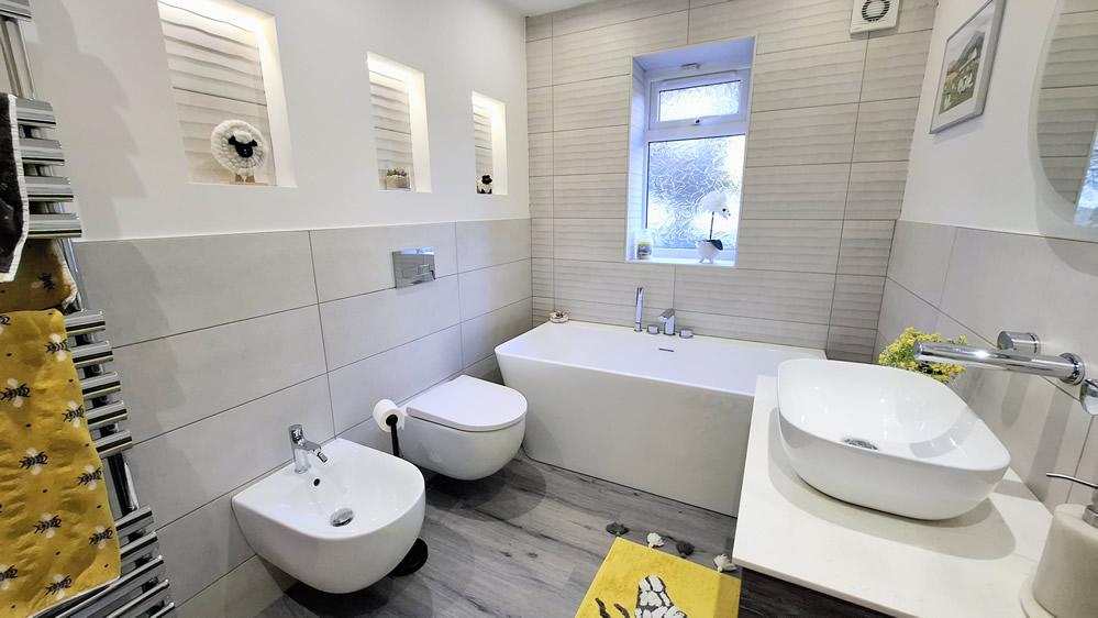 This gorgeously designed bathroom includes: wall hung WC, bidet, heated towel rail, counter top wash hand basin with drawer under, lit mirror above, and double ended bath with mixer tap – hand held shower.