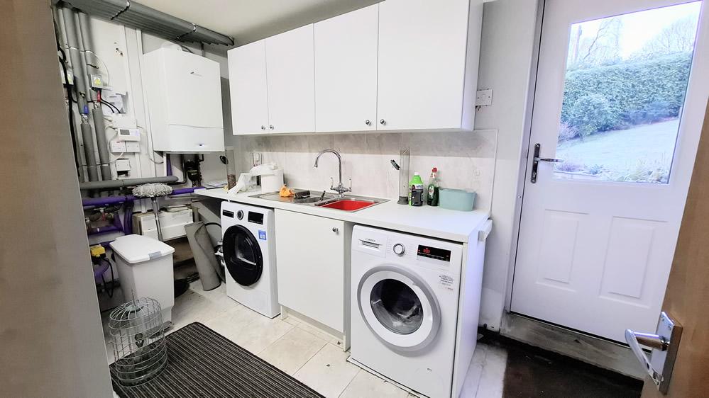 Accessed through the garage and leading onto the garden, the utility room has fitted cupboards, work top, sink, and space for a washing machine and clothes dryer.