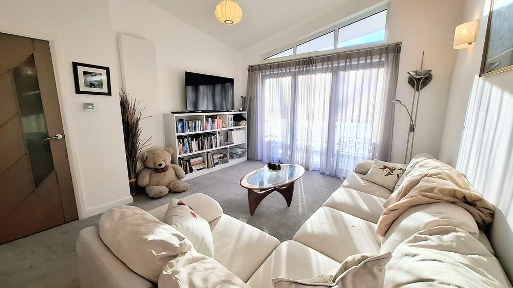 Currently used as a reception room, bedroom 2 features bifold doors opening onto a balcony. It has a fitted wardrobe with sliding doors, and there is plenty of room to accommodate a double bed with a range of other furniture.