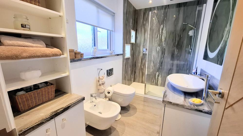 The main bedroom's ensuite includes: wall hung WC, bidet, walk-in shower, counter top wash hand basin with cupboard under, heated towel rail, lit mirror, and a cupboard with open shelving.
