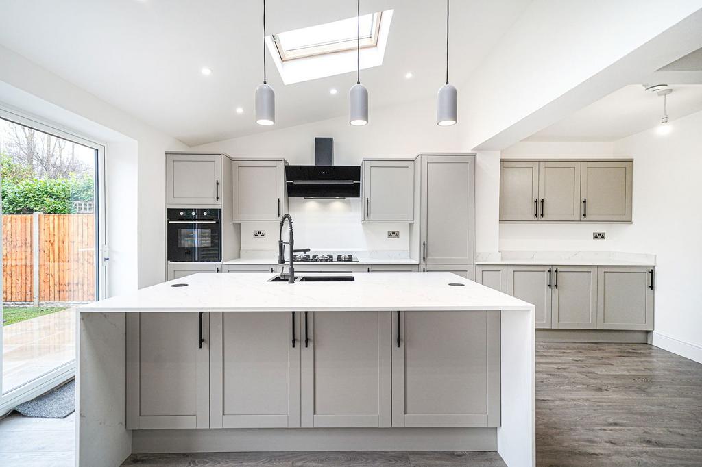 Having a range of grey Shaker style wall and base units with square edged Quartz worksurfaces over, sink and drainer unit, integrated dishwasher, integrated fridge freezer, integrated washing machine and dishwasher, five ring gas hob with extractor over and built-in electric cooker, four ceiling light points, range of ceiling spotlights, two Velux windows, three wall mounted radiators, hard wired heat alarm, laminate flooring and bi-folding doors leading out to the rear garden
