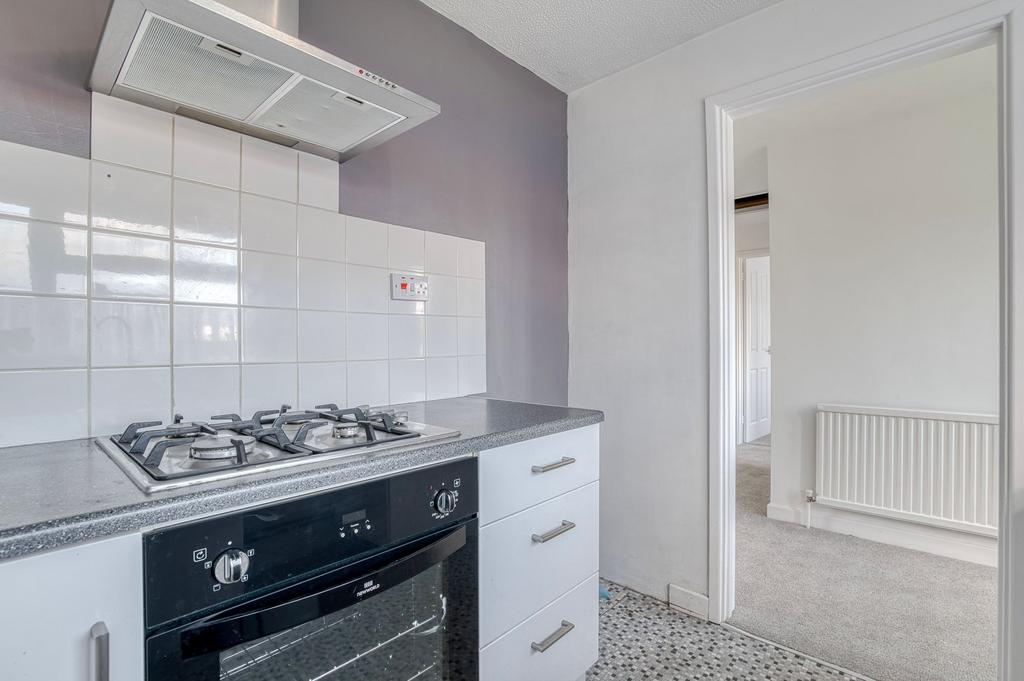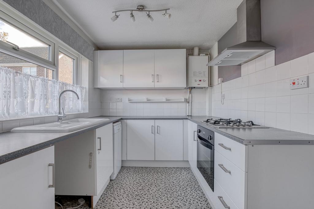 The kitchen sits at the front of the property and features white fitted units, generous work surfaces and tiled splashbacks. A wide front-facing window fills the room with natural light. Integrated appliances include a gas hob, an extractor hood, an oven and a dishwasher, with further space available beneath the counters. The patterned flooring gives the room a clean and modern finish while keeping everything easy to maintain. The entire property has been freshly redecorated with new carpets laid throughout, offering a fully turnkey feel.