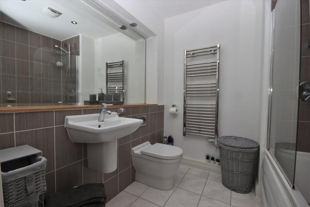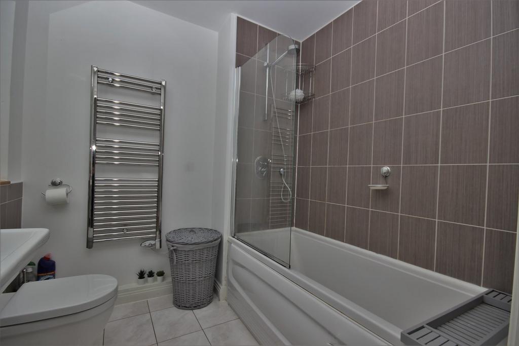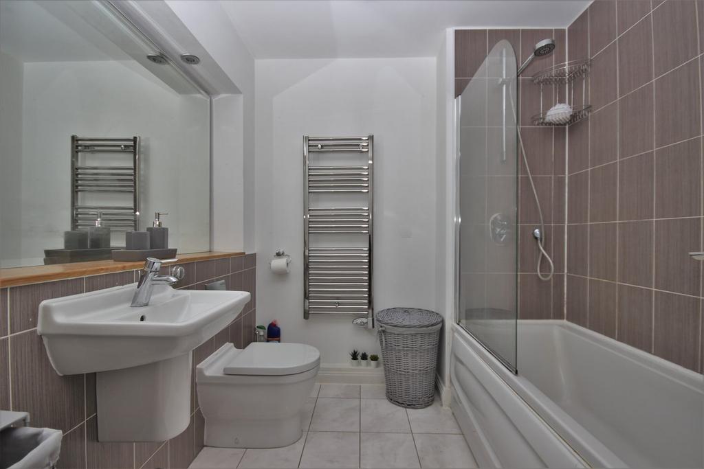 Three piece white suite with chrome fittings. Bath with Chrome shower over, Heated chrome towel rail, vanity feature dressing mirror with integral down lights, four spot lights to ceiling, ceramic tiles to floor, half tiled walls to bath and shower.