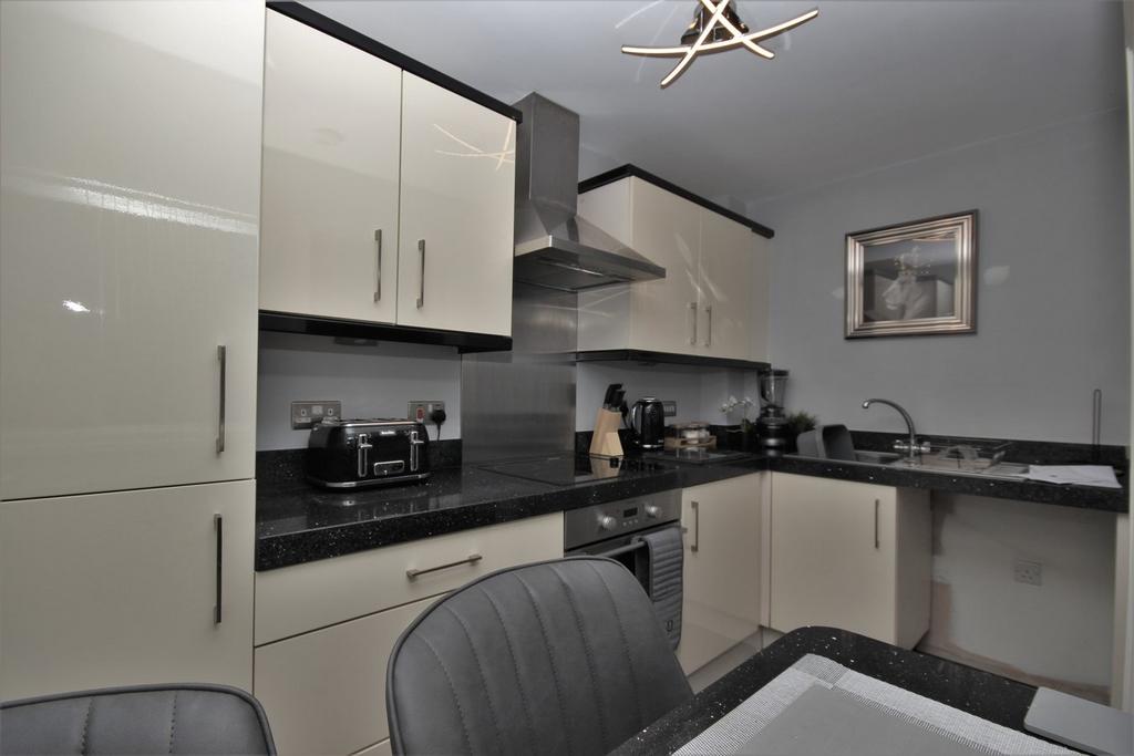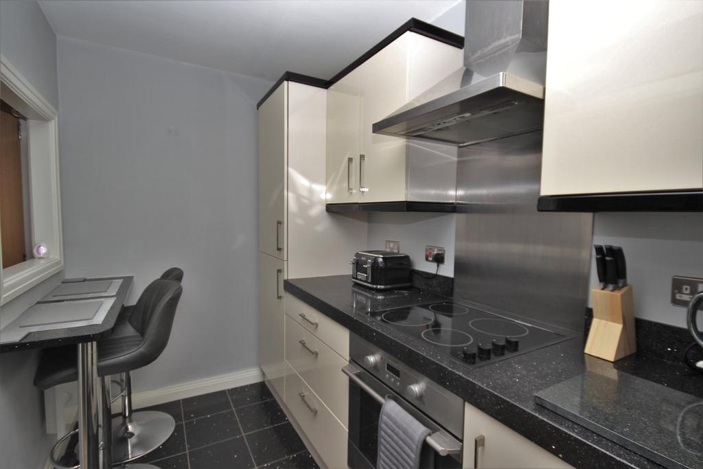 Cream wall & base units in high gloss finish with black sparkle granite work top and splash backs, breakfast bar, Black sparkle tile to floor, integral electric oven and hob, extractor fan, space and plumbing for a washing machine, integrated fridge/freezer, ceiling spot light, stainless steel sink with chrome mixer tap, wall heater.