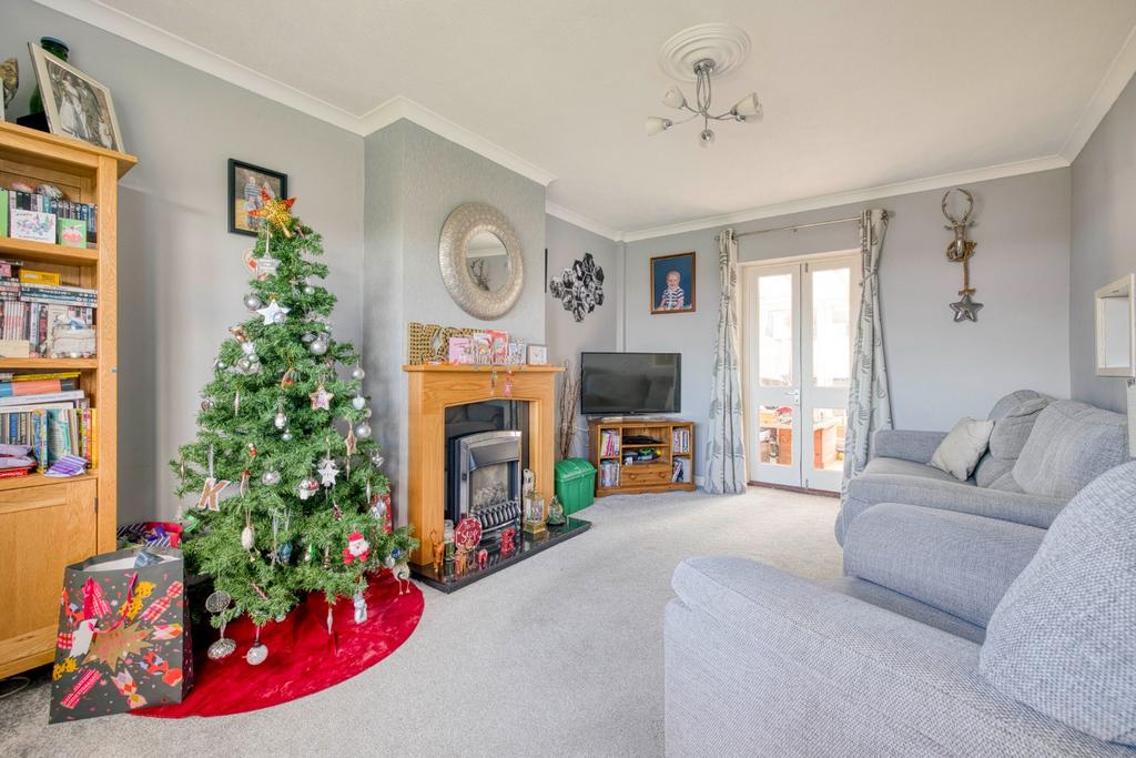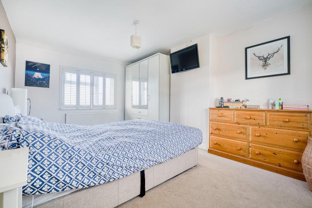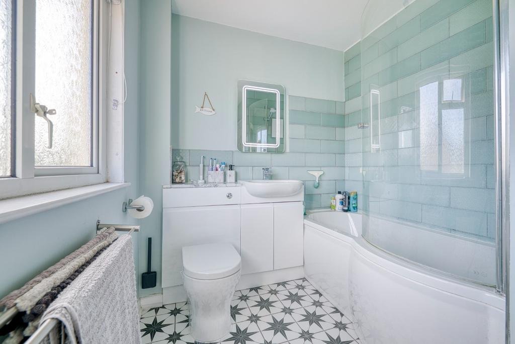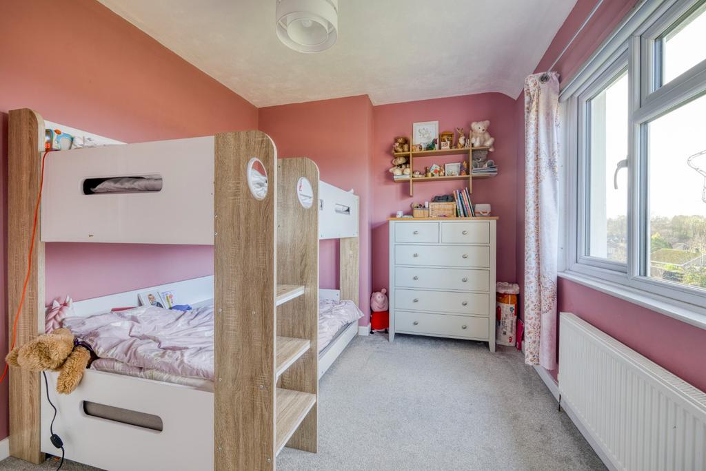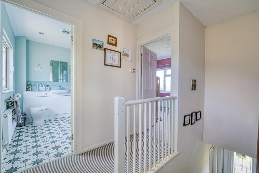 On the first floor, the landing gives access to two double bedrooms and the family bathroom. The principal bedroom is particularly generous, benefiting from dual aspects and excellent natural light. The bathroom has been recently refitted with modern sanitaryware and features underfloor heating.
