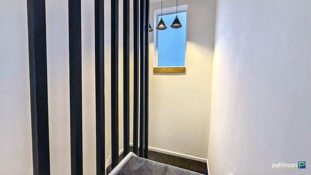 Window to rear with wood windowsill, black balustrade, loft access hatch to ceiling.